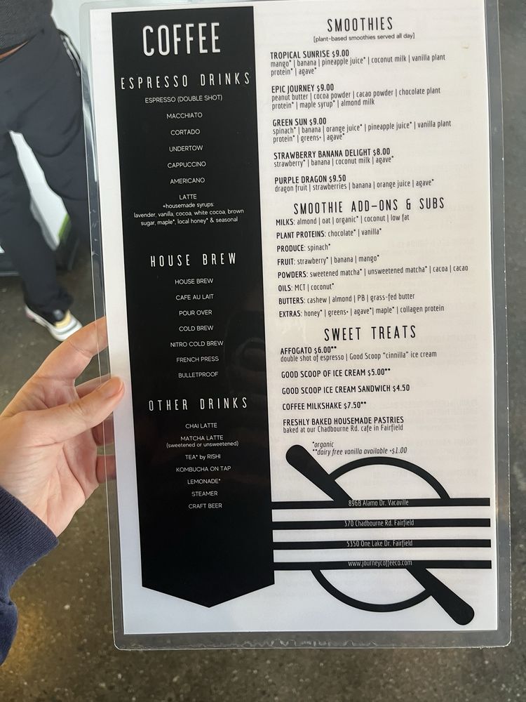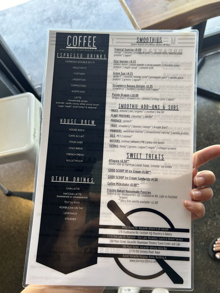 Journey Coffee, located in Vacaville, CA, offers a unique experience for coffee enthusiasts and foodies alike. With a focus on quality and community, this locally owned coffee shop stands out for its excellent espresso, friendly service, and cozy atmosphere. Customers praise the variety of options on the menu, including the South African latte and the first-class breakfast wrap with bacon. The staff is known for their helpful recommendations and willingness to accommodate special requests. The café also provides a range of amenities, such as free Wi-Fi, outdoor seating, and vegan options. With a commitment to sustainability, Journey Coffee offers compostable containers and plastic-free packaging. Whether you're stopping by for a quick coffee, meeting friends, or getting work done, Journey Coffee is a top choice in Vacaville for delicious drinks and a welcoming environment.